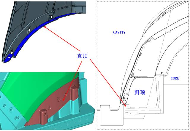 扣位采用在直頂上做隧道彈塊的結構進行脫模: