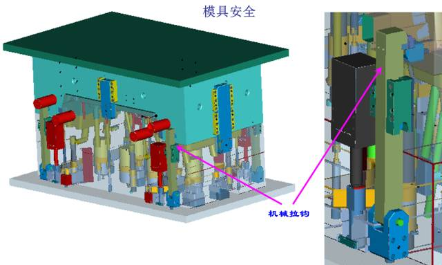 (1)第一級頂出采用4個油缸頂出同前模同步運動頂出60MM,4個拉鉤為輔助機構;
