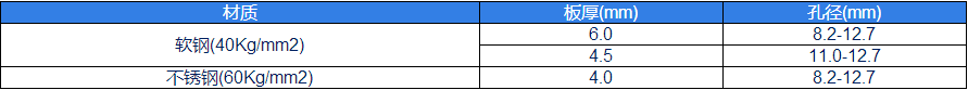 材質板厚(mm)孔徑(mm)軟鋼(40Kg/mm2)6.08.2-12.74.511.0-12.7不銹鋼(60Kg/mm2)4.08.2-12.7